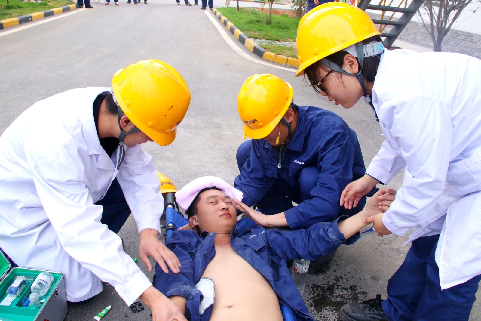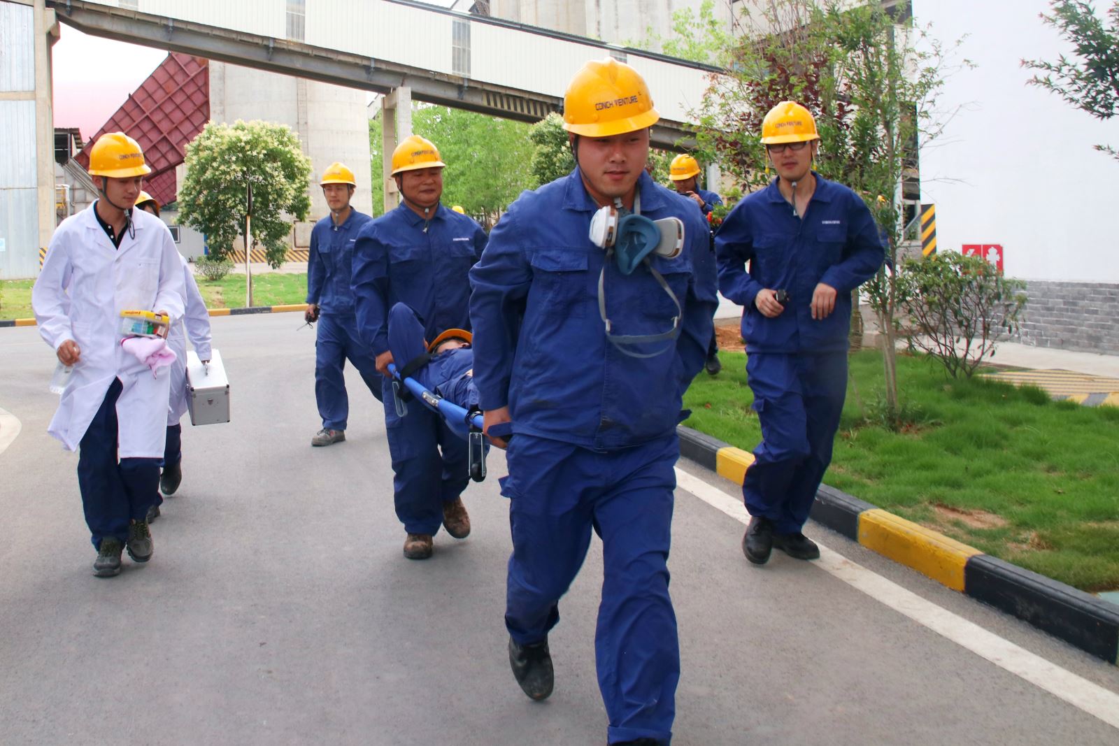 ? ? 6月24日下午,公司組織開展了高溫中暑應急演練。15:00,總指揮接到報告,卸料大廳有人昏倒在地,應急救援小組立即啟動預案,根據患者情況,迅速作出判斷,轉移至安全地帶進行救治。