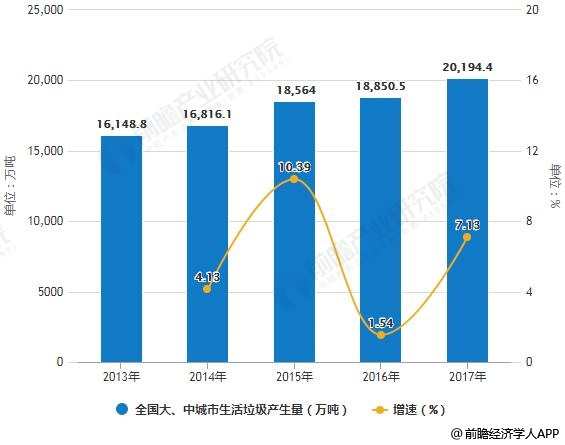 2013-2017年全國大、中城市生活垃圾產生量統計及增長情況