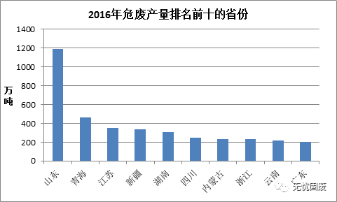 ? ? 其中山東危廢產(chǎn)生量最多,高達(dá)1188.28萬噸,其次是青海,產(chǎn)生量為462.05萬噸,江蘇危廢產(chǎn)生量為350.98萬噸,排名第三。