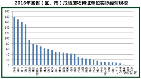 ? ? 截至2016年,全國危險(xiǎn)廢物經(jīng)營持證單位共2195家,核準(zhǔn)經(jīng)營規(guī)模達(dá)到6471萬噸,平均每家約2.9萬噸。但實(shí)際經(jīng)營規(guī)模為1629萬噸,平均每家不足0.75萬噸。實(shí)際經(jīng)營規(guī)模排在前三位的分別是浙江、山東和廣東。